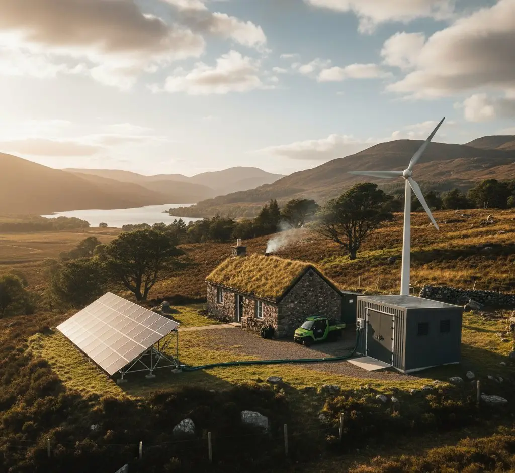 Many successful off-grid UK installations use solar as the primary source with a small diesel or propane generator as winter backup. The generator might run 50–100 hours per year (November to February) to bridge solar shortfalls. This hybrid approach is far more practical and affordable than sizing the solar/battery system for 100% coverage year-round. Annual generator fuel cost: £100–£300.